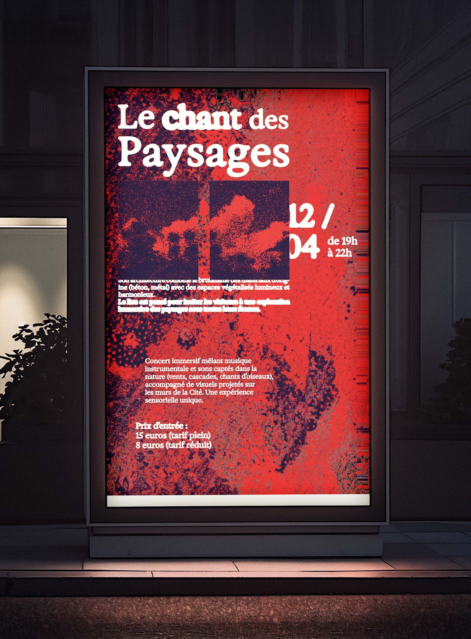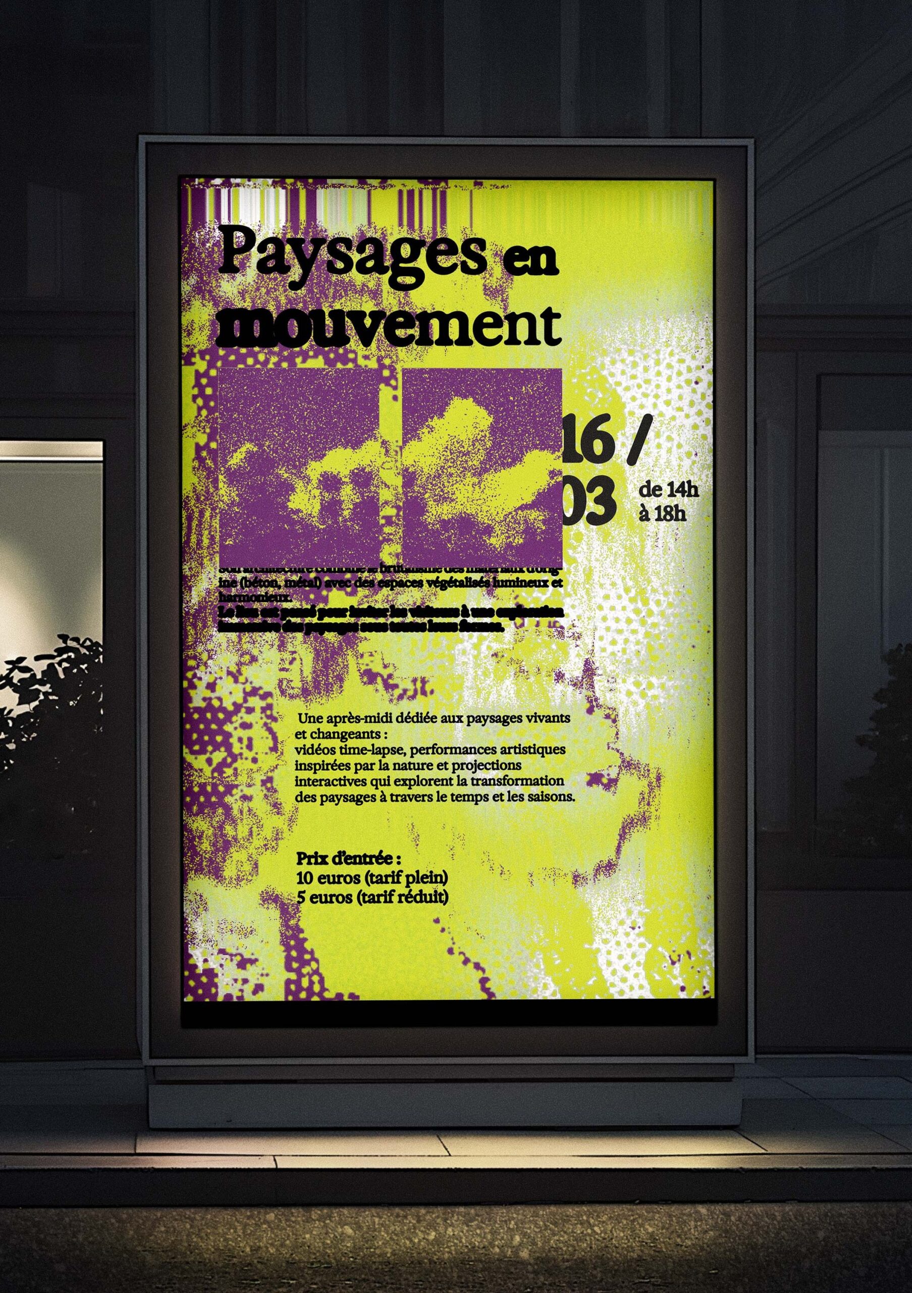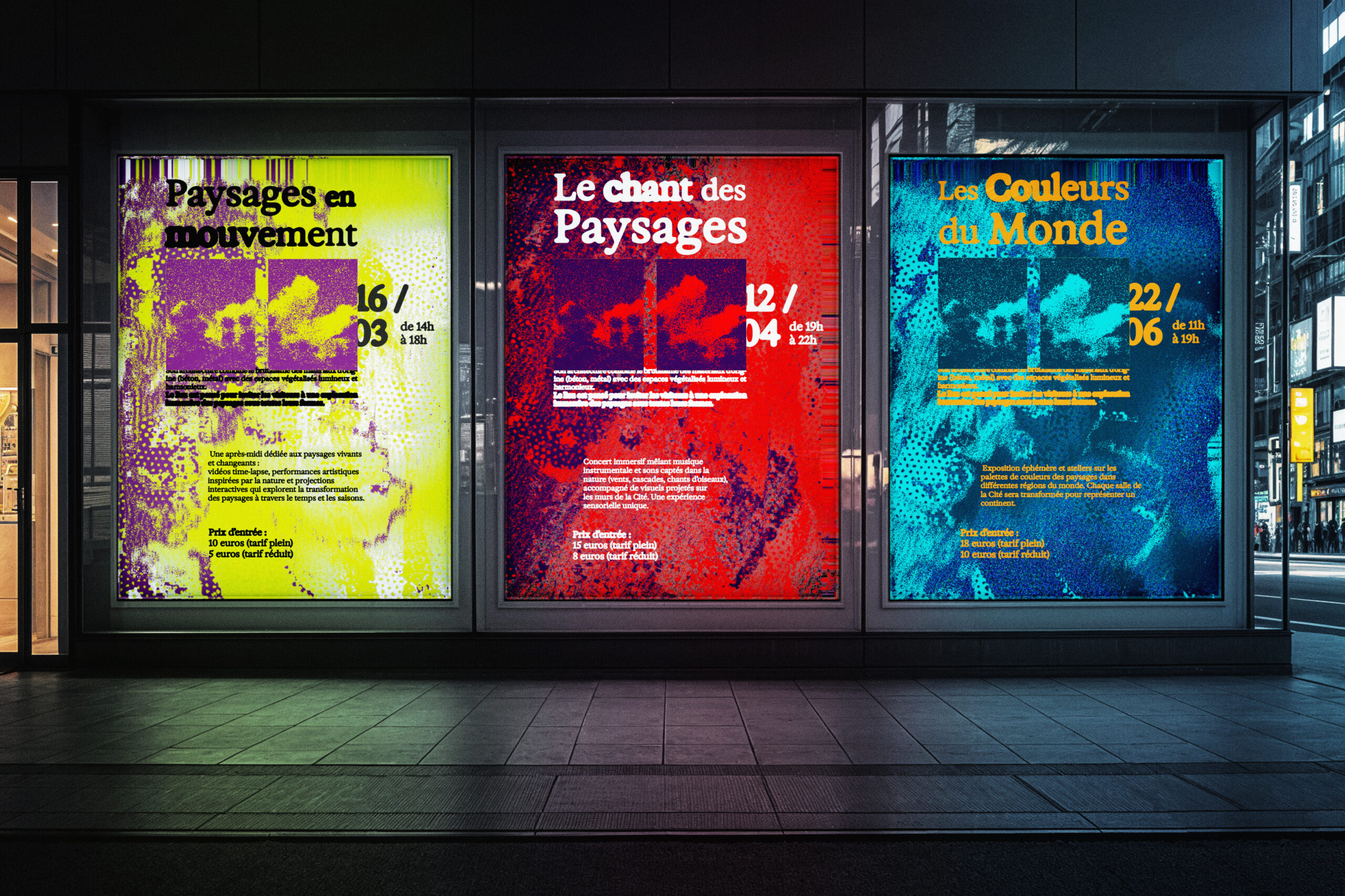 Création d’une série d’affiches autour de la mission universelle du paysage, qui cherche à faire du paysage un langage commun et porteur de sens. Mon approche visuelle s’appuie sur des effets graphiques et des couleurs dynamiques pour transmettre la diversité et l’énergie de ce thème. Le projet explore la capacité du graphisme à raconter, interpeller et relier par l’image.